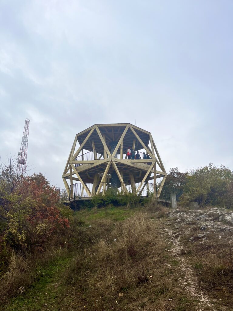 From here, after passing by a small memorial site, we carry on to the highest point of the hike, the Lookout Sphere on top of Hármashatár-hegy (Three Border Mountain), which is a magnificent spot to take in the views of the northern part of the city.